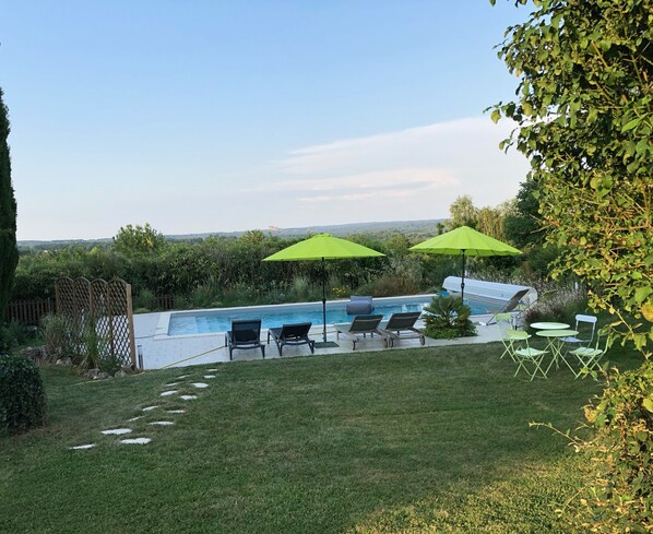 Piscine privée 10 x 5m avec une plage carrelée. Système de sécurité : volant roulant électrique solaire