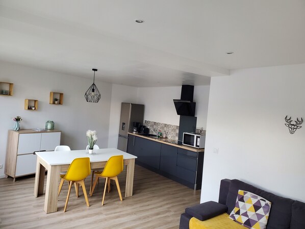 - une salle comprenant une table, 4 chaises (+2 chaises pliantes supplémentaires), un vaisselier