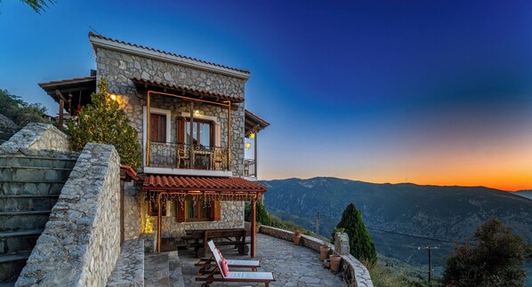 Rock Dandy est une maison à forte personnalité. C'est une villa en pierre de trois étages située dans un petit complexe de maisons offrant une vue imprenable sur l'Oracle de Delphes, les montagnes, la vallée, Itea.