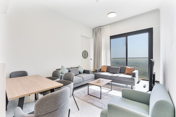 ✓ Comfortable sofa ✓ 50” Smart TV ✓ Stylish coffee table ✓ Access to the private balcony