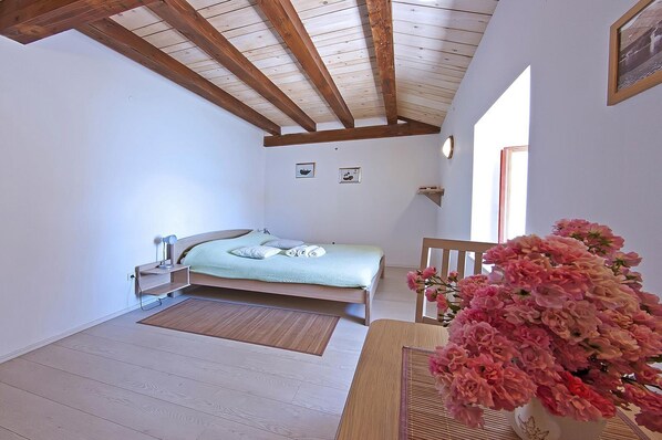 Grande chambre avec lit double, vue sur la mer, 2ème étage, salle de bain privée avec douche.