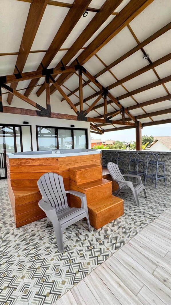 It features a rooftop jacuzzi on the second floor terrace, perfect for relaxing while enjoying the view of the lagoon and the sea. It's the ideal retreat for families or groups of friends looking to unwind, reconnect, and enjoy the peace of the beach.