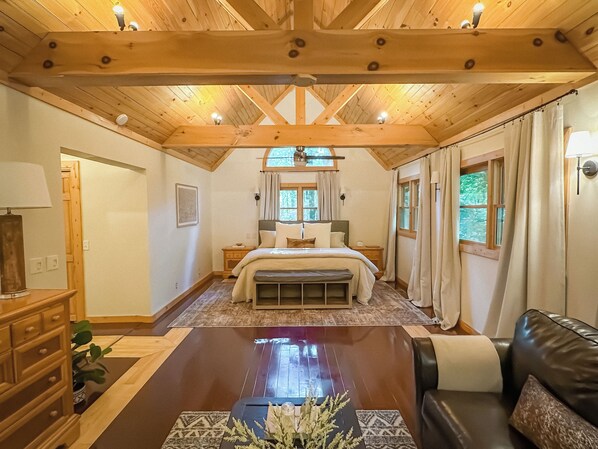 The massive main suite on the second floor has a swing and a vaulted ceiling that provides an airy ambiance. The other queen bedroom is also spacious and features a walk-out porch inviting you to step outside and enjoy nature in privacy. Prepare yourself a hot coffee first thing in the morning, thanks to the coffee bar in the room, and sip it while taking in the sights and sounds.