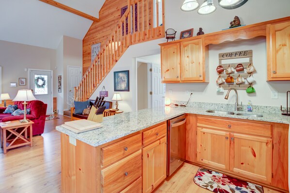 An exceptional stay awaits at this quiet, wooded vacation home located in the Coosawattee River Resort. With soaring ceilings, knotty-pine wall paneling, and a stone fireplace, you’ll have no problem settling in to cabin time. Step out onto the deck or into the sunroom with your coffee first thing in the morning and watch for the deer that frequent the back yard every day. When hunger calls, make breakfast in the open, spacious kitchen, with a full suite of appliances and plenty of counter space. Dine together at the table for six, or have a seat at the table in the sunroom and enjoy the lovely wooded surroundings while you eat.