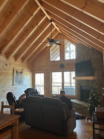Whitetail Ridge, dans le Coosawattee River Resort, dispose d’un espace de vie confortable, d’une cheminée en pierre