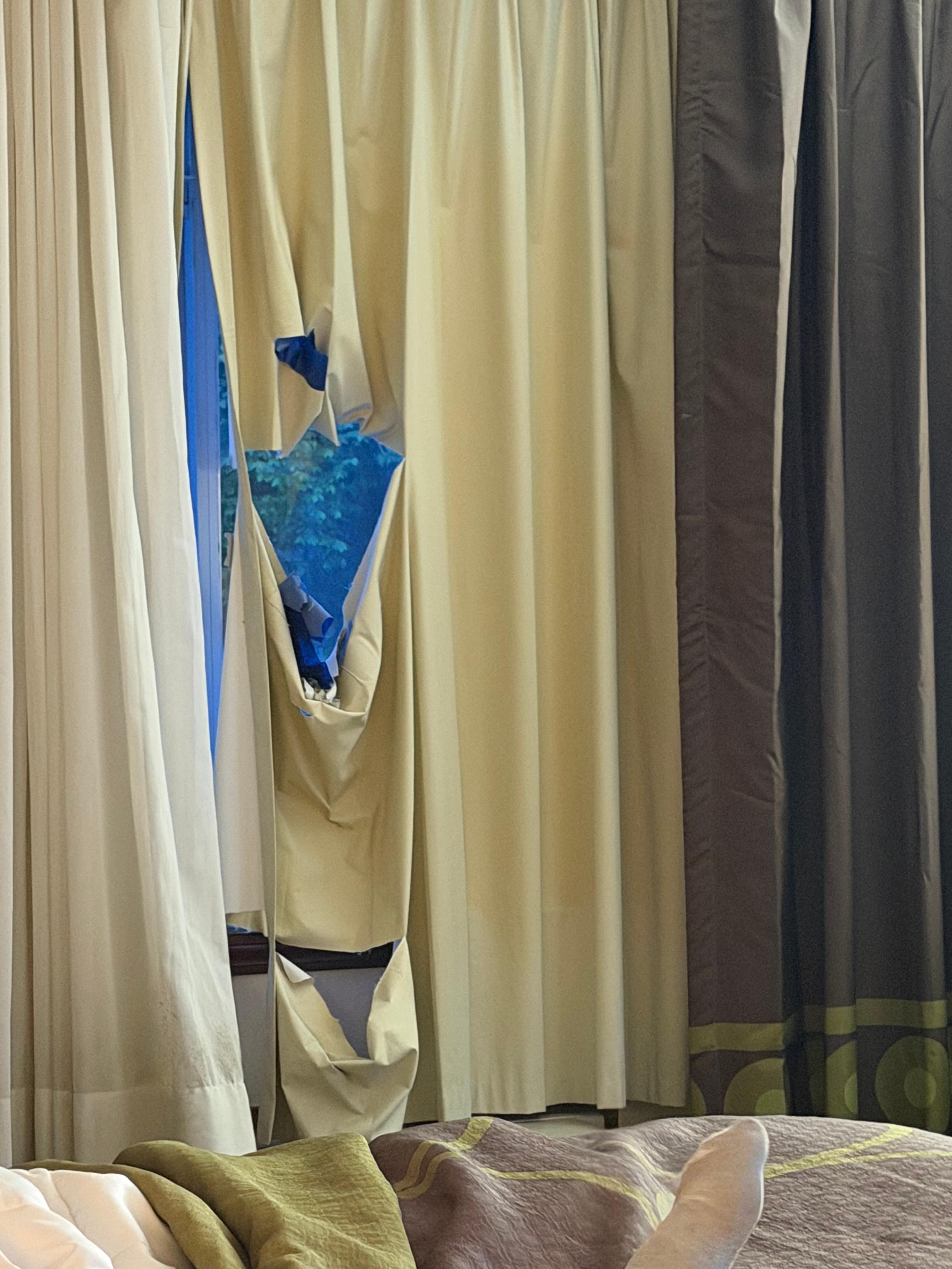 1. The blackout curtain over the window had huge tears in it. It looked like someone tried to repair it with blue painters tape, but the tape didn't hold it together at all.