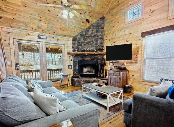 MAIN FLOOR: This beautiful cabin features 1 bedroom with one Queen bed, a full bathroom, washer/dryer, and living space with a wood fireplace and TV, dining table seats 7, ceiling fan