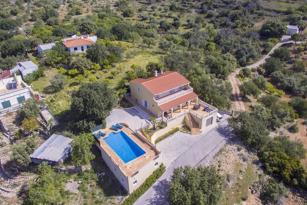 À l'extérieur, la villa dispose d'une piscine de 10 5 mètres (profondeur 1,2–2,6 m), entourée de transats et de plusieurs espaces de repos sur la terrasse, créant un espace accueillant. Le chauffage de la piscine est disponible entre avril et octobre avec un préavis de 48 h et à un coût supplémentaire, sous réserve de conditions météorologiques appropriées. Il y a également un parking privé spacieux sur la propriété.