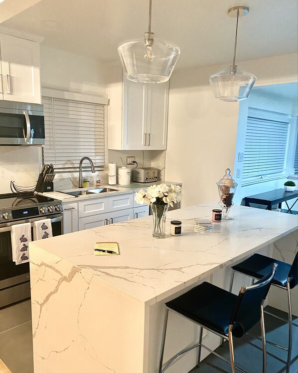 The open living space is perfect for relaxing. This home has numerous smart tv's, which includes a 75 inch Smart TV in the family room to enjoy Cable, Netflix, Hulu, Disney+ and other major streaming services! Enjoy the newly renovated fully equipped kitchen with a bar, mini-fridge, and a Keurig for your coffee needs.