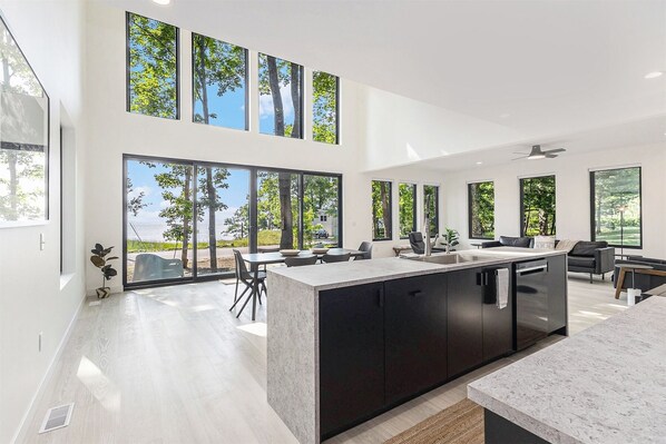 Now fully complete and ready to welcome guests, The Tig invites you to experience lakeshore living at its most serene. Step inside and instantly exhale — the main level opens to a two-story great room flooded with natural light and framed by panoramic windows that showcase views of Lake Michigan. Whether you're lounging in the cozy living area, preparing fresh local fare in the fully equipped kitchen, or gathering for slow meals at the dining table, you’ll always be surrounded by peace and beauty.