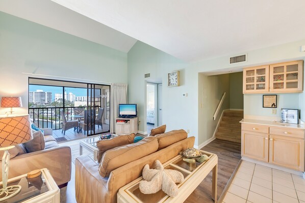 Enjoy the spacious living area equipped with - tile/laminate flooring, and carpet in the bedroom upstairs. Sliding glass doors separate the Living Room from the Screened In Lanai and bring in loads of sunlight. The dining area has a glass topped table for six and a huge window that overlooks the atrium. When you aren't using the table for meals, it makes a great place to sit and play board games or cards or even work remotely with ease. The living room has comfortable seating for the whole family to relax and enjoy watching the TV - just the sort of place you would want to unwind in after a day of boating, fishing, shell collecting or exploring the island. Right off the living area is the wonderful screened in lanai where you can sit and relax for hours. You can also dine alfresco out on the screened in lanai - it has its own ceiling fan so you can sit and chat with family and friends while taking in the cool evening breezes.