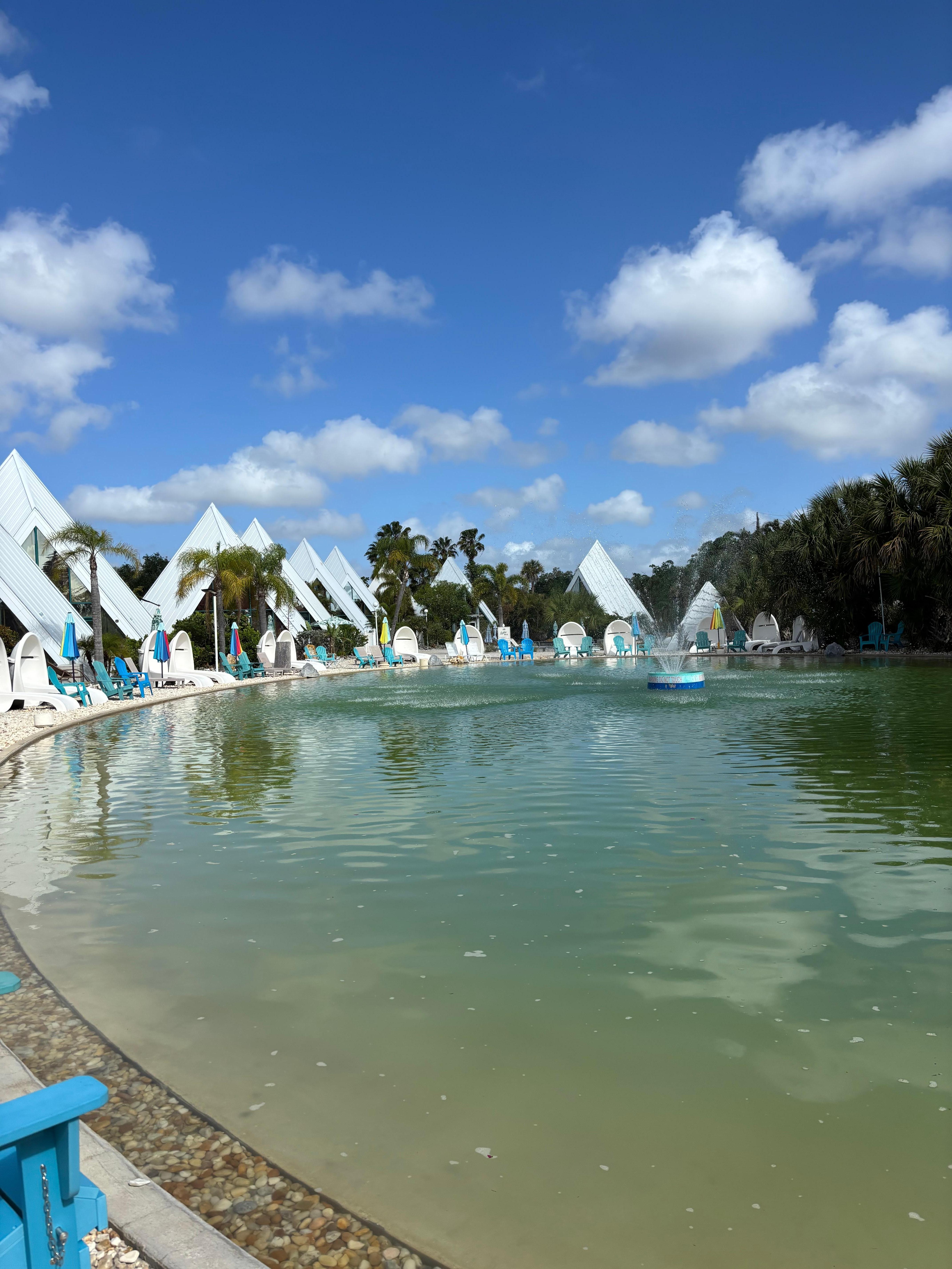 Cette pyramide n'est pas directement au bord du lac, cependant, la plupart des clients préfèrent son emplacement car elle offre beaucoup plus d'intimité tout en étant à quelques pas du lac. La communauté est petite et confortable, ce qui rend tout facilement accessible. Le lac d'eau de source naturelle n'est pas chauffé, mais il offre une excellente évasion rafraîchissante du soleil de Floride! Nous encourageons nos clients à se baigner dans cette merveilleuse eau relaxante à l'état naturel. L'eau provient d'une source minérale naturelle, sa couleur peut donc varier du bleu limpide au vert foncé en fonction des éléments naturels de l'environnement.