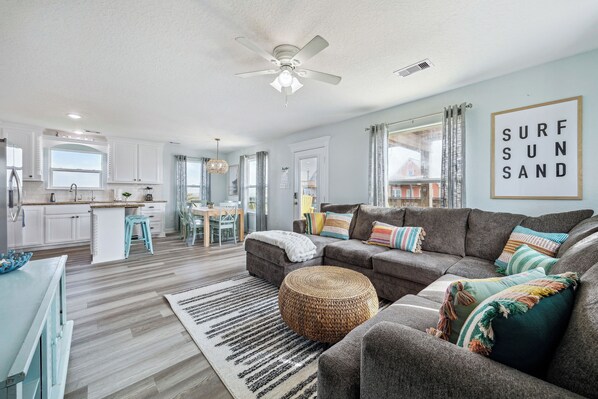 À l'intérieur, vous serez accueilli par un plan d'étage ouvert, lumineux et lumineux, rempli de meubles haut de gamme et d'un décor de plage. Des équipements modernes et des détails bien pensés vous feront vous sentir comme chez vous. Avec un grand canapé en coupe, une TV connectée 4K de 50 pouces avec câble et Netflix, et un thermostat Nest pour créer le climat idéal, le salon est l'endroit idéal pour se détendre après une longue journée au soleil. Mais avec le Wifi haut débit pour le streaming et un téléviseur HD dans chaque pièce, tout le monde peut regarder son propre show. Juste à côté du salon se trouve la cuisine ouverte, avec des comptoirs en granit, des appareils en acier inoxydable et des armoires personnalisées. Savourez des repas à table pour 6 personnes, avec de la place pour 2 autres sur l'îlot de cuisine. Avec un système de filtration d'eau pour toute la maison et un filtre RO sur le réfrigérateur, vous aurez toujours accès à une eau pure et savoureuse.
