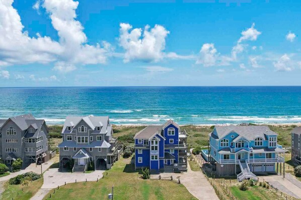 A wide, paved driveway makes it easy to park and unload, with an inside ground-level elevator providing that extra lift. First thing to unpack will be your swimsuit, as the private ground level pool and the just-over-the-dunes Atlantic beach will be an immediate and irresistible lure. Also conveniently located on the ground level is an outdoor shower, foot-washing station, and an outside lavatory. On the first level is a comfortable family room, complete with wet bar and entertainment center to accommodate some indoor R&R. Missing the beach already? An expansive oceanfront deck reminds you it’s still there in all its quiet and natural beauty. Also on this level is a washer/dryer and two of the home’s master bedrooms: an oceanfront queen with private bath and access to the deck and a sound-facing queen with private bath. Three more bedrooms are located on the second level, including a master king with private bath and deck access and a queen that shares a bath with the “kids” room that features two singles with a trundle. All of the bedroom’s feature TVs. Completing this level is a six-person hot tub located on the deck where you can soak up the views and the feeling of contentment as your body gives in to the calming moment.