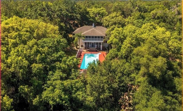 We built an entertainment museum for guests to enjoy. The home was built in 1900 and it looks similar to the Home Alone house. Inside looks like you stepped back in time 100 years, visiting your great grandmothers house with all her cool stuff still on display. Everything is nostalgic throughout the home. Outside there’s an entertainment paradise to enjoy. Fun games which allow you to enjoy this large, secluded property to the fullest. Home on 5 acres in safe neighborhood with endless parking. Outside: Home sits on 5 acres and neighbors are far away for maximum privacy. It has the largest pool in the Lake county, 20x45. Overlooking the pool is a large pergola patio with lots of seating and outdoor lighting. There is a locking entrance gate. There is a 4 car garage. We have 1,000+ trees on the property including many 100 year old spooky oak trees, with swings of course. Parking for RVs, boats or 100+ cars. The property is huge and extremely safe. Enjoy morning coffee on the screened patio overlooking the lake and watching the birds play in the trees. The wildlife plays wonderful music in the morning. We have a full court basketball with 2 hoops, 9-hole frisbee golf course, a pickleball court, pool volleyball net, soccer nets, horseshoes, golf putting green, mini yoga studio, retro bicycles… Inside: Inside the home looks like you stepped into the 1900s. I keep everything old school. The vintage furnishings, funky mirrors, 100+ black and white nostalgic photos and rich oil paintings throughout the house. You can play a game of chess on the 2nd floor patio overlooking the lake while watching the wildlife play in the trees. The home has everything you need for cooking, pressure cooker, rice cooker, blender… There is a laundry room and a game room that is off the charts cool. Full size pool table, 2 professional arcade games with 100+ gaming options, old school Atari with 200+ games, x-box with games, and a monster TV on the wall. The game room has lots of nostalgic pictures to enjoy. There’s an indoor bowling set and a 15ft golf putting green. We have 2 indoor fireplaces in the living room with another monster TV and lots of seating. The living room connects to a large screened outdoor patio, giving a sense of outdoor living space to the inside. Upstairs has an additional screened patio with a sleeper bed and lots of seating. Chess lovers can enjoy a beautiful lake view and wildlife sounds while playing on vintage chess board. No bottled water needed. Brand new whole house water filter/conditioner system with an additional 7 stage filter for super fresh water at the sink. Home has central heat, air conditioning and ceiling fans to keep everyone comfortable. There are 2 humidifiers to use if needed. The property is close to everything. We are 1 mile from the Villages, 1 mile to restaurants, 2 miles to Walmart, Aldi, 45 min to Disney, 1 hr to Orlando airport.