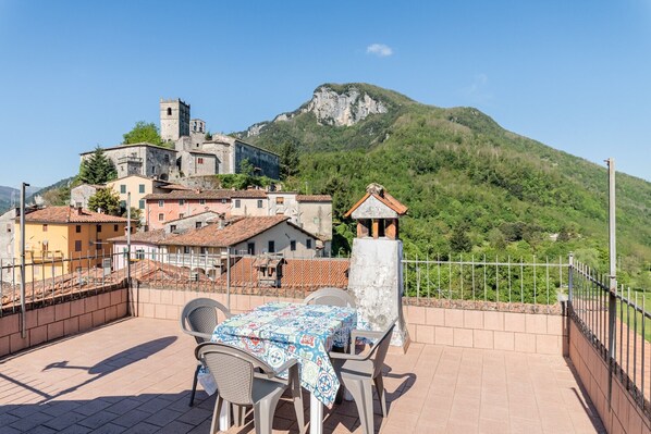 La maison est aménagée sur deux niveaux. Au premier étage, un petit couloir mène à un grand salon avec téléviseur à écran plat, et à la cuisine avec tout ce dont vous avez besoin et équipée d'un lave-vaisselle, d'un four électrique, d'un four à micro-ondes, d'un réfrigérateur avec congélateur, d'une plaque de cuisson. A l'étage supérieur il y a deux grandes chambres doubles et une salle de bain avec douche, machine à laver et séchoir. De l'étage, on accède, par un escalier intérieur, à une grande terrasse panoramique d'où l'on peut admirer la vallée du fleuve Serchio et son affluent le Turrite Cava.