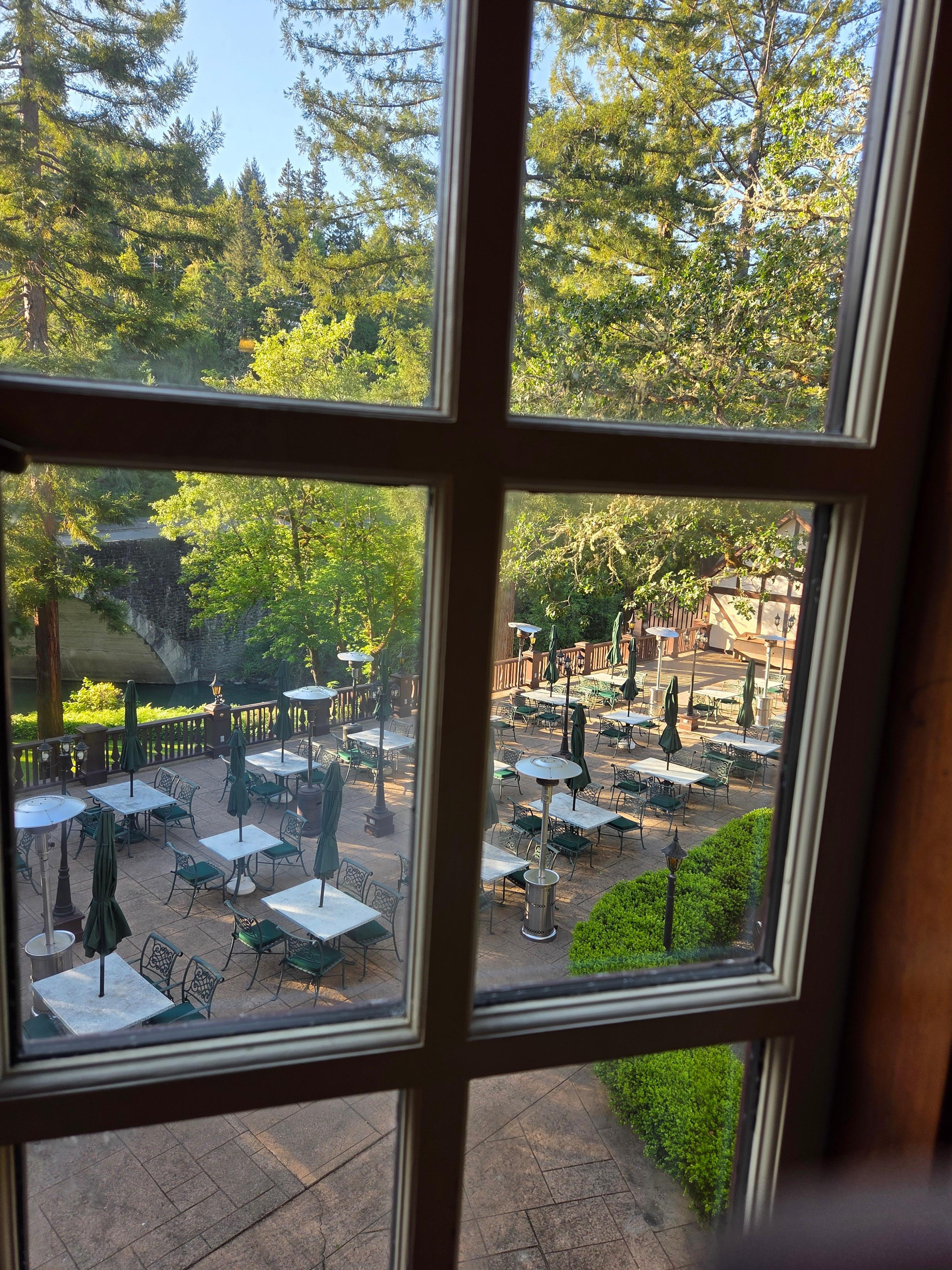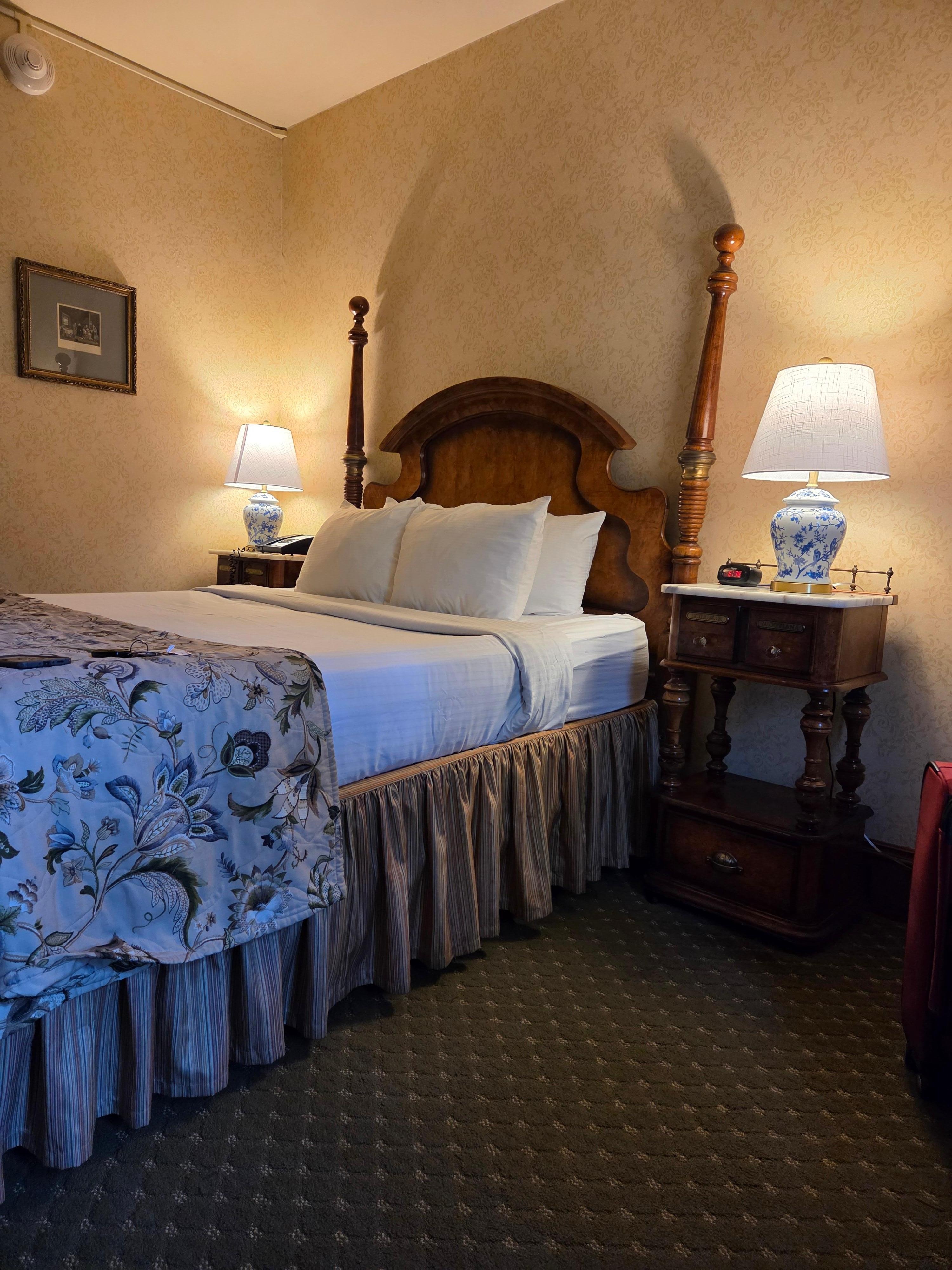Nice nostalgic room, clean, good bed. Bathroom was smaller but ok. Grounds were beautiful. Large outdoor patio. No free breakfast but restaurant had very good food.