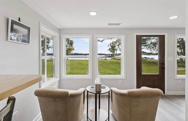 LIVING & ENTERTAINMENT The home features two distinct living rooms, both equipped with Smart TVs for movie nights. The main floor living area boasts a beautiful stone fireplace and large windows framing breathtaking lake views. Upstairs, a second living room offers a perfect spot for fun with a selection of games, puzzles, and books.