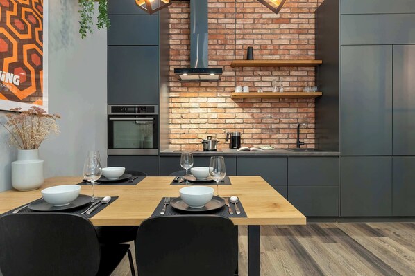 Modern interior design with a distinct industrial touch. A separate bedroom equipped with a spacious wardrobe, providing comfort and convenience for storing your belongings. A private garden with outdoor furniture, perfect for relaxing in the fresh air. A parking space in the garage, suitable for cars with LPG installation. Excellent location on the picturesque Granary Island, close to the main attractions. High-speed Wi-Fi and a Smart TV with access to platforms such as Netflix, HBO, YouTube, Prime Video, and Canal+. VAT invoices can be issued upon guest request.