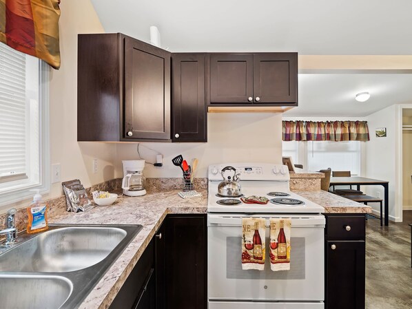 Our cozy cottage is designed with your comfort in mind. Full kitchen for cooking meals, comfortable living room to hang out with friends and family, and two queen sized beds so you can sleep in tranquility. Enjoy our little front porch with lounge chairs for those beautiful Geneva-On-The-Lake evenings.