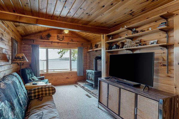 Inside, you’ll find a cozy interior with a full kitchen and fast WiFi. Kick back by the stove to stream favorite shows in the lake-view living area, or head out to the waterfront deck for after-dinner drinks.