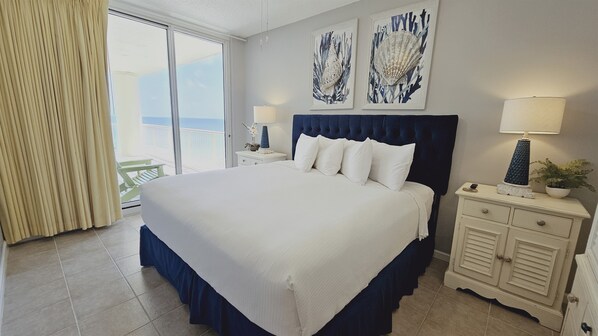 Sleeps 6 in beds. The master bed is a king size and the guest bed is a queen PLUS a bunk bed. Both privately, adjoin a bathroom. There is No sleeper. The beds are made with crisp white linen. Fluffy white bath linen is supplied, so bring make up removal cloths. Whether you choose to dine-in or out, you will enjoy the granite counters and a full kitchen with a combo washer/dryer. There is a one day set up of basic complimentary amenities. Please plan to shop for your additional needs. Wireless internet is available in the condo and throughout the property.