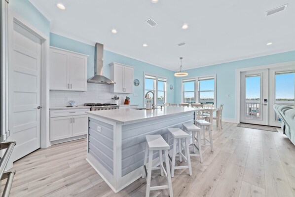 The heart of the home is a bright and airy open-concept space where the living room, dining area, and gourmet kitchen seamlessly come together. Whether you’re lounging after a beach day or gathering for a family meal, this spacious layout is designed for connection and comfort. The fully equipped kitchen features sleek stainless steel appliances, ample counter space, and everything you need to whip up anything from morning coffee to a coastal-inspired feast. Just steps away, the dining area invites everyone to sit down and share meals, stories, and laughter. The living room offers cozy seating, warm natural light, and a welcoming space to unwind together—perfect for movie nights, game days, or simply soaking in the beach house vibes.