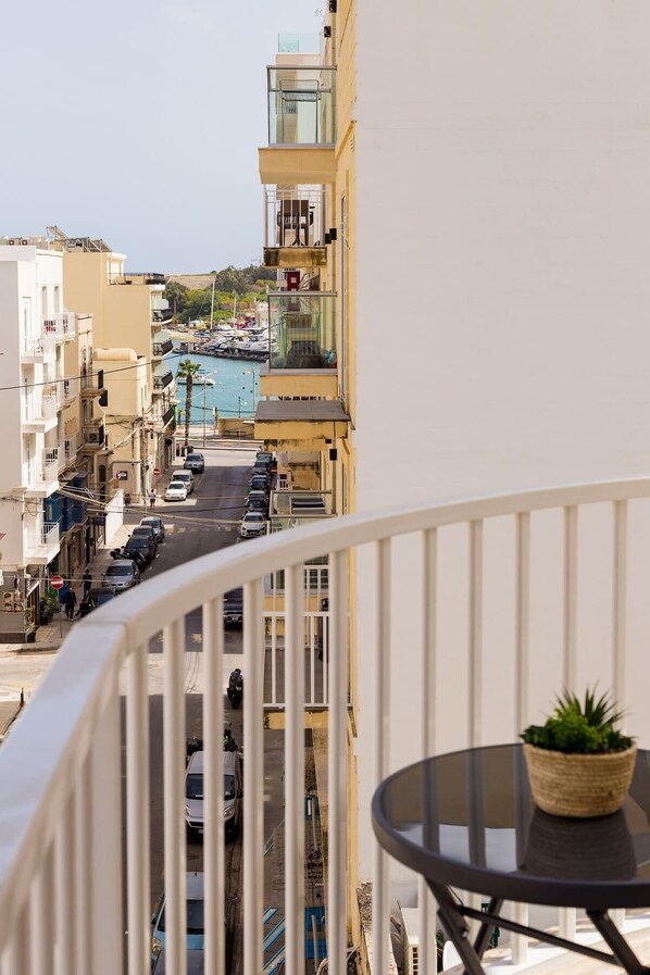 The heart of the apartment is the open-plan kitchen and living space, where you can cook, unwind, or catch up over a glass of wine. A Nespresso machine and fully equipped kitchen make mornings easy, while the Smart TV and fast Wi-Fi help you settle in after a day out. Floor-to-ceiling glass opens onto the balcony, where you can catch glimpses of the sea and soak in the warm, golden glow Malta is known for.