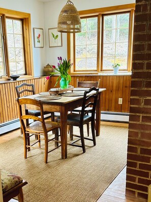 DINING ROOM: bright windowed dining room looking onto our currently-under construction yard. Hardwood floors, vintage furnishings. Local pottery.