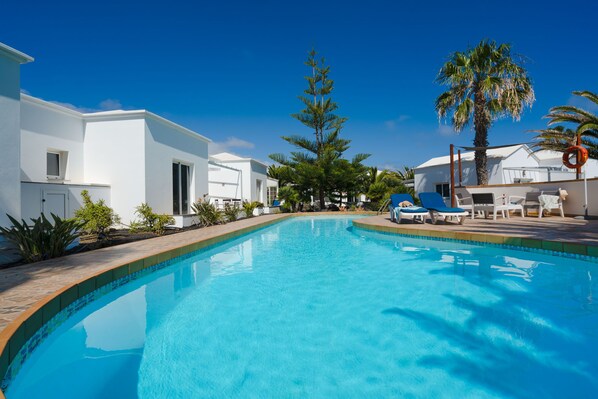Small and quiet private complex with only 9 bungalows with communal heated pool, sun loungers and outdoor furniture surrounded by gardens.