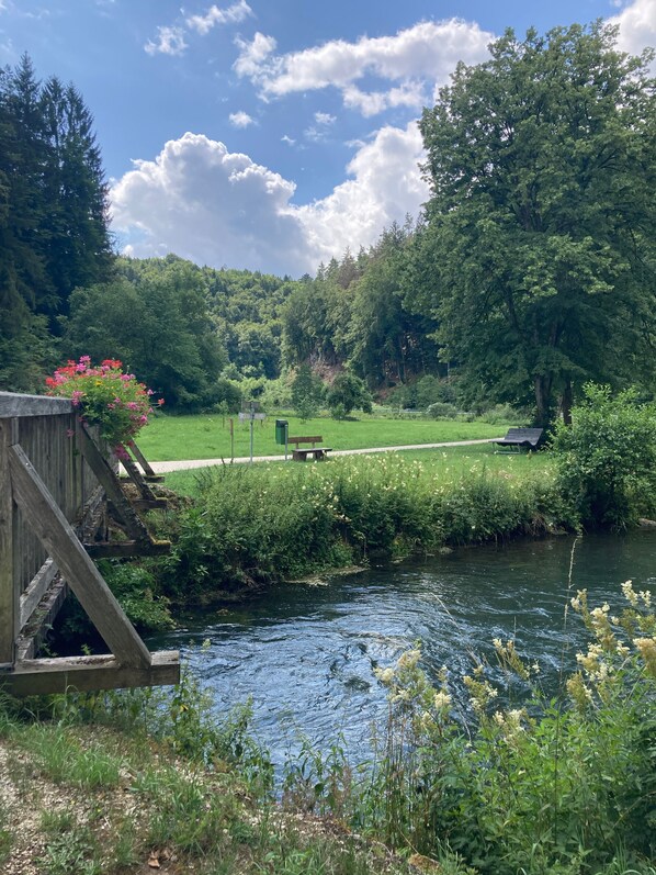 Les transports en commun sont accessibles à pied. Commerces, cafés, aire de jeux et borne de recharge pour voitures électriques se trouvent à proximité. À proximité : les thermes de Hersbruck, le golf de Gerhelm, Palm Beach, le Playmobil Fun Park, Zirndorf et la ligne de train Neuhaus-Nuremberg-Bayreuth. L'appartement est situé au cœur de la Suisse franconienne, entouré de prairies, forêts, grottes, falaises d'escalade, pistes cyclables et sentiers de randonnée.
