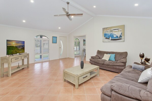 Sandy Shores Accommodating 10 guests, each bed is thoughtfully prepared with fresh linen and towels are included. After a lengthy drive, simply unpack and unwind. No hassle with bedding – just pure relaxation awaits. With lovely Air Conditioning, spacious living area, modern 4-bedroom home close to Korogoro Creek. Sandy Shores features 2 bathrooms, an enclosed outdoor space, and a beach-ready outdoor shower.