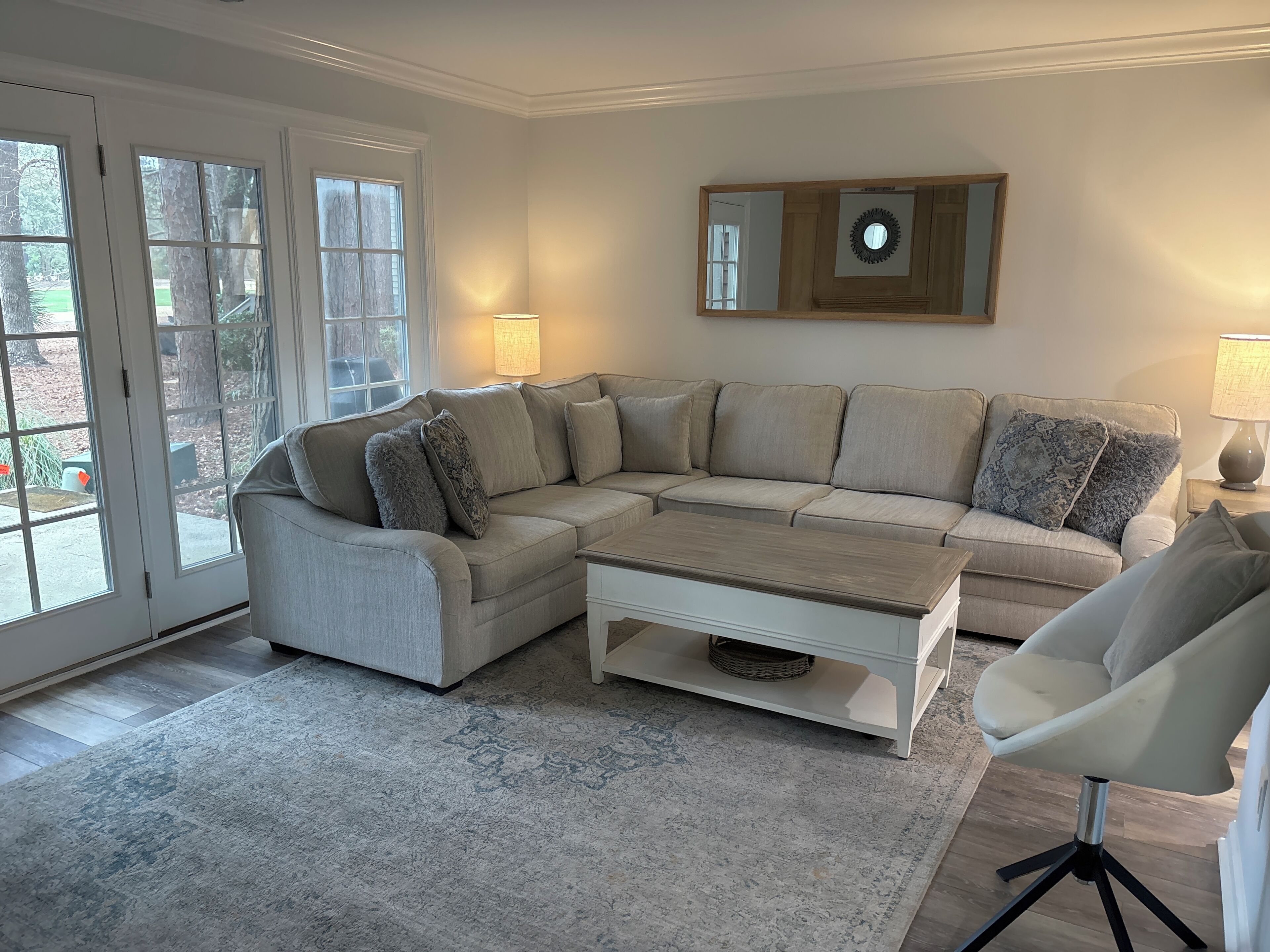 La chambre principale a un lit king et un siège d'amour qui se ouvre sur un lit double. Le capitaine de bain a été récemment rénové et il ya beaucoup de serviettes propres disponibles. La deuxième chambre a deux lits jumeaux et se connecte à l'autre salle de bain récemment rénové. Les deux chambres sont équipées de ventilateurs de plafond pour votre confort.