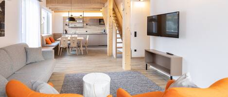 The attractive living room has a sitting area with a smart TV and a spacious dining area where you can have a tasty meal. The modern kitchenette has, among other things, a combi microwave, dishwasher, Nespresso machine, refrigerator with freezer compartment, and a 2-burner hob. In addition, a safe is available that you can use for free.