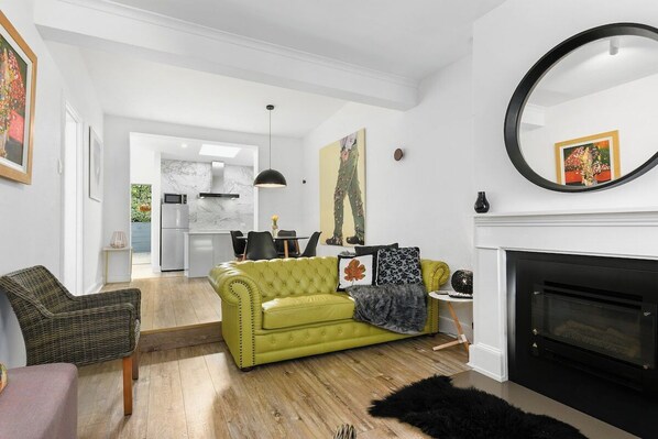 Abundant natural light, cosy gas fireplace, designer furniture and art adorned walls create both a warm and luminous feel during your stay.