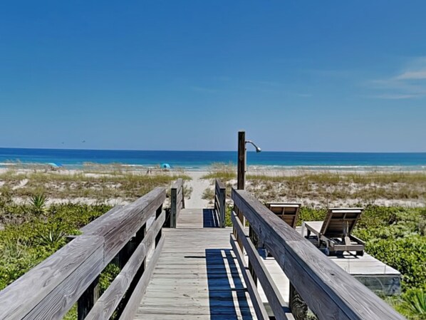 Passerelle privée à la plage avec un coin salon sur la dune.