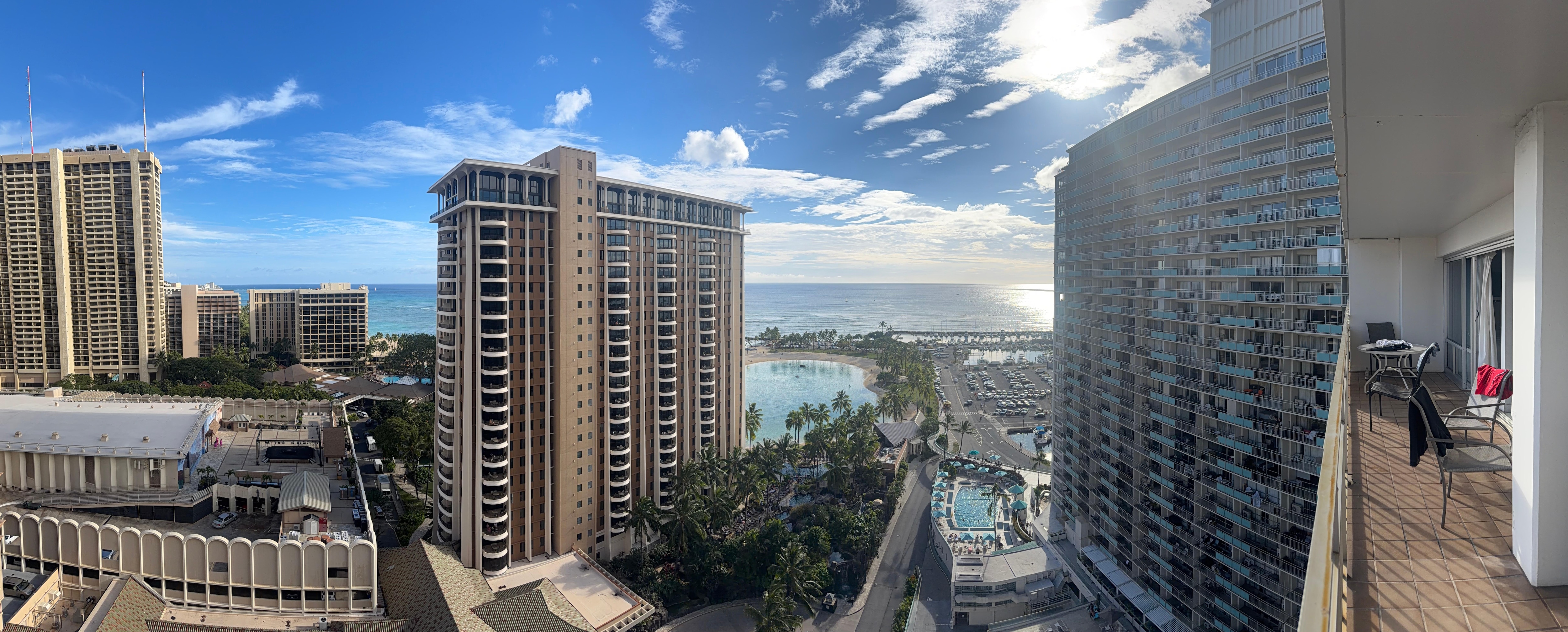 The location of this property is perfect for our family. Walking distance to the mall and all the shopping along Waikiki. 2 great pools with lots of sun and lots of amenities right in the building. The beach is beautiful and you don’t have to go far to be right in the heart of Waikiki beach. The suite had enough room for 5 of us with room to spare. The view is amazing. Overlooking the lagoon and ocean with a double length lanai was perfect for starting the morning watching the sunrise with a coffee, and ending the day with a nightcap overlooking the lights. The only downsides to this property were the lack of basic sundries (dish soap, toilet paper, paper towels, garbage bags, dishwasher detergent etc). With a 2 week stay for 5, 3 rolls of toilet paper wasn’t enough. We had to go out and buy everything to make it through our stay. Another issue was the taps in both bathrooms leaked and the counters were soaked and wound run off onto the toilet paper roll. Which added to the shortage!! And the appliances were in need of updating and the oven didn’t work properly and there was only one burner on the stove top that worked. We cooked a lot so it was a bit of a struggle. Some small changes would make this a premium unit. We will definitely be booking this unit again!