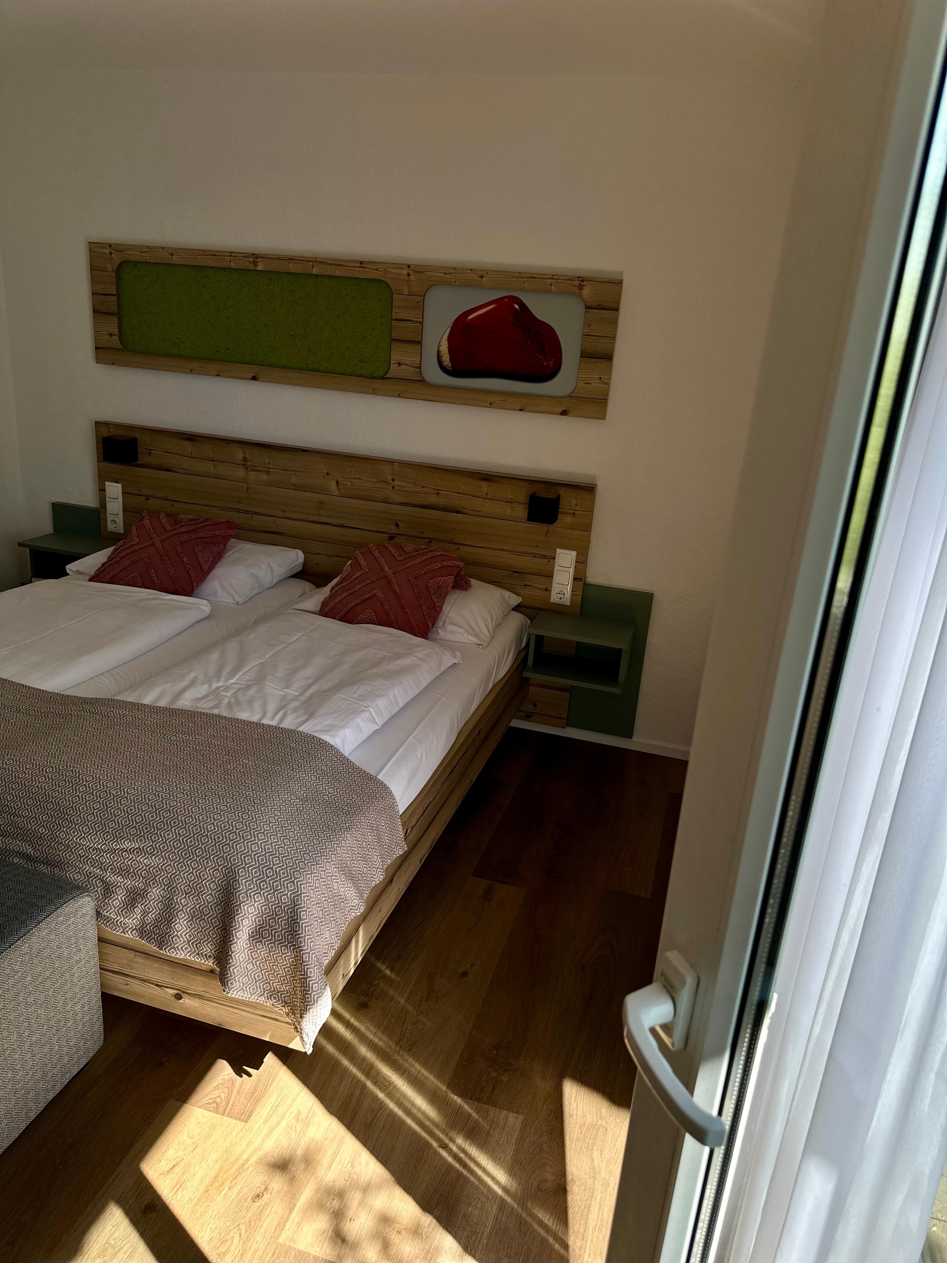 Außerhalb des Ortes gelegen, daher sehr ruhig, ganz wunderbar. Zimmer zweckmäßig eingerichtet, Bett sehr bequem, kleiner Balkon mit Ausblick ins Grüne, Bad prima.