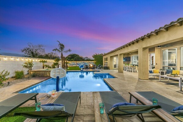 À l'extérieur: La magnifique cour s'étend sur un demi-acre et comprend une piscine d'eau salée étincelante et un spa avec une profondeur de 8 pieds et une étagère de bronzage, entourés de chaises longues, d'hibiscus, de palmiers et d'arbres fruitiers. Le grand foyer à gaz pouvant accueillir 8 personnes est l’endroit idéal pour se détendre une nuit dans le désert. La casita détachée près de la piscine dispose également d'un foyer extérieur. Il y a plusieurs autres options de terrasse avec 4 chaises longues, un divan sectionnel pour 10 personnes et 8 chaises berçantes de terrasse. Faites griller votre dîner sur le très grand barbecue intégré et dînez à la table pour 6 personnes en plein air ou à 4 tabourets de bar sur l’île barbecue. Allumez le four à pizza extérieur personnalisé pour une expérience culinaire unique. En fonction de votre température, allumez les brumisateurs, les ventilateurs de plafond ou le chauffage intégré! Défiez vos amis à une partie de pétanque ou de croquet! Chez Azul, il y a de la place pour tout faire ou rien du tout.