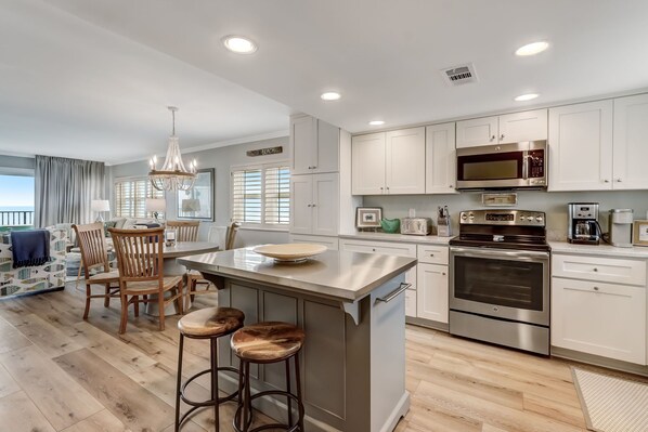 Direct oceanfront views and abundant sunshine fill this end unit beauty which exudes casual coastal charm throughout! Upon entry guests will immediately notice the sparkling new kitchen with white cabinetry and stunning quartz countertops. The contrasting stainless topped island provides additional space for meal preparation or a great spot to set up a little afternoon happy hour! There are also two barstools for additional seating. The adjacent dining space is outfitted with a round wooden table and chairs and can accommodate up to six people.