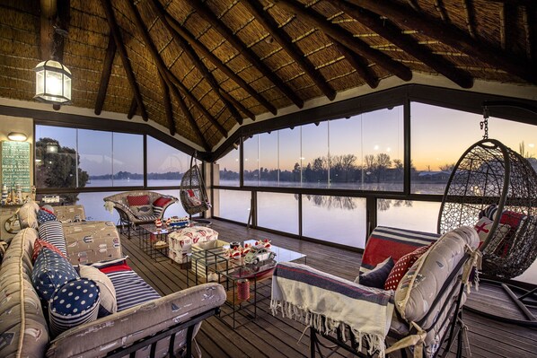 The unique ‘Boathouse’ is a glass-walled sun-room suspended above the Vaal River and is a spectacular place to spend any time of the day. The 'Boathouse' also has its own, hammock, lounge an an 8-seater dining room table. For endless relaxation, there is also a 3-seater swing as well as 4 additional hammocks on the jetty.