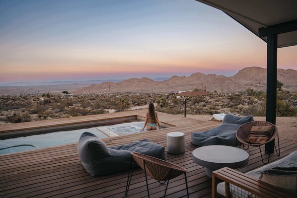 Step outside into a private oasis that truly sets Overlook Joshua Tree apart. The centerpiece is the in-ground pool and spa, surrounded by a wooden deck with plush pouf loungers and cozy seating areas where you can soak up the sun or unwind beneath the stars. The spacious outdoor area also includes a gas firepit, perfect for gathering around on cool desert evenings, and a large dining table where you can enjoy meals under twinkling bistro lights and with sweeping views of the landscape. For added fun, challenge your friends to a game of cornhole or simply relax with a book in the peaceful desert breeze. The property’s direct access to Joshua Tree National Park means you can set off on an adventure right from your doorstep, exploring trails, wildlife, and the quiet beauty of the desert.