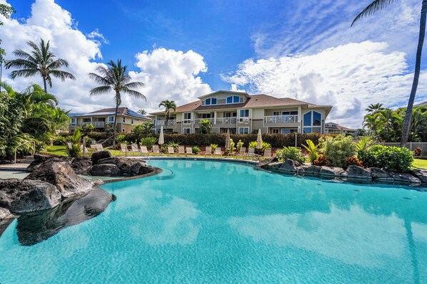 2-story ocean-view condo with 2 lanais, central AC, pool & hot tub - near Honl's