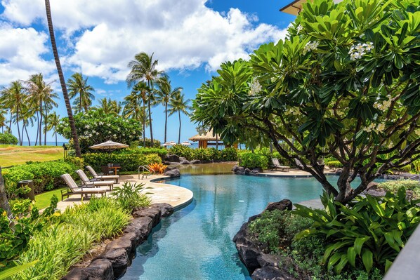 The large outdoor Lanai has both pools and ocean views, four cozy lounge seats and another table with two chairs. Very relaxing day and night from the Lanai.