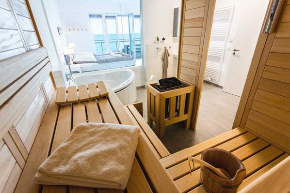Dat Penthuus est situé dans la zone accessible par un ascenseur 3. Premier étage du Molenhuus, à seulement 6 mètres (!) loin de la mer Baltique. L'appartement peut accueillir jusqu'à 5 personnes et est équipé d'excellente qualité. Un salon meublé avec goût avec un canapé moelleux vous offre une vue sur la mer onirique, directe et probablement unique. Vient ensuite une très grande terrasse sur le toit, où vous pourrez profiter de la vue imprenable sur la mer Baltique en extérieur. La cuisine entièrement équipée comprend une table à manger accueillante avec des sièges confortables, un réfrigérateur-congélateur, un four, un micro-ondes, un lave-vaisselle et bien sûr d'autres ustensiles de cuisine. Deux chambres confortables - une avec vue sur la mer - sont chacune meublées avec un lit double boxspring. En outre, une salle de douche et une autre salle de bains avec son propre sauna, à partir de laquelle vous avez également une vue libre sur la mer Baltique, et une baignoire à l'appartement. Un espace de stationnement attribué à l'appartement pour votre voiture est situé directement à l'immeuble. De nombreux autres équipements tels que le Wi-Fi, la télévision et un lave-linge à pièces complètent votre offre de vacances.