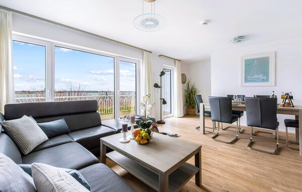 Au premier étage se trouve la zone de repos. Ici, deux chambres à coucher offrent suffisamment de place pour faire le plein d'énergie. Dans la chambre principale, avec vue directe sur la Schlei, il est possible de se réveiller et de s'endormir dans un décor de rêve. Une autre chambre à coucher permet de voir, par-dessus la rue, le port de voile et de plaisance du OstseeResort. Toujours à ce niveau se trouve une salle de bain complète avec douche et baignoire balnéo relaxante pour un programme de bien-être privé.