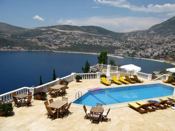 Wide sliding doors connect to the large outside terrace (11 m x 3 m) with exceptional views both over the bay and Kalkan itself. It's very private and not overlooked. Here you can relax in your own Jacuzzi sun loungers and sun umbrella.