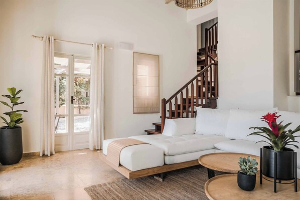 Beautiful traditional Kefalonian architecture outside and comfortable elegant interiors, the ground floor living/dining room open out onto the pool terrace and enjoys the beautiful views, whilst the kitchen is on a split level up a few steps. There is a brick built bbq provided so you can cook and eat al fresco and enjoy the beautiful setting.
