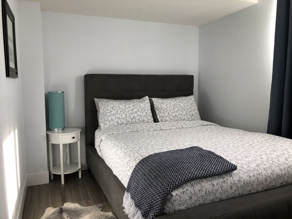 La chambre à coucher dispose d'un lit queen size avec un tout nouveau matelas King Coil Euro Top et de rideaux occultants. Il y a aussi un canapé en coupe avec le lit gigogne dans le salon.