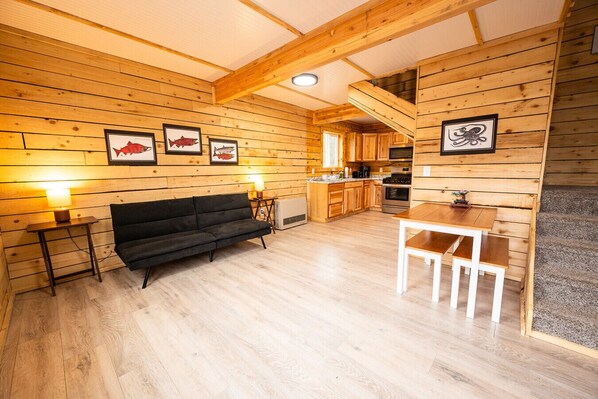 The Halibut Haven is a compact but comfortable cabin, perfect to use as a basecamp for all your Kenai adventures. The main floor is an open concept living, dining, and full kitchen space perfect for kicking back after a long day. When you`re ready to retire, enjoy any of the six beds (2 Queens, 4 Twins) in the upstairs loft, or the additional futon in the living room.